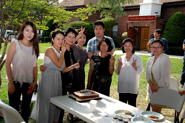 한 여름날 잔디밭에 모여 7월에 태어난 성도님들의 생일케잌과